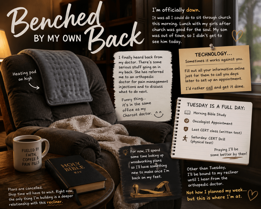 As for tomorrow, those plans are officially cancelled. I was supposed to head to the shop and do some woodworking to get ready for my next show, but there’s no way that’s happening. Right now, the only thing I’m building is a deeper relationship with this recliner.